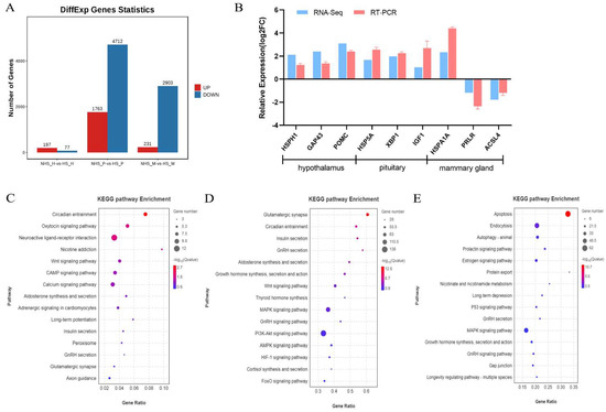 The analysis identified 197, 1763, and 231 upregulated DEmRNAs, and 77, 4712, and 2903 downregulated DEmRNAs in the hypothalamus, pituitary, and mammary gland, respectively (Figure 7A). We verified the expression of randomly selected mRNAs (HSPH1, GAP43, POMC, HSP5A, XBP1, IGF1, HSPA1A, PRLR, and ACSL4) from HPM axis-related tissues by RT-qPCR. The results were all consistent with those obtained using RNA-seq (Figure 7B). For the DEmRNAs, 341, 1292, and 756 GO terms (p < 0.01) were significantly enriched in the hypothalamus, pituitary gland, and mammary gland, respectively (Supplementary Figure S2). Among the significantly enriched KEGG pathways, circadian entrainment was the most significantly enriched in the hypothalamus (Figure 7C, p < 0.05), and the cAMP signaling pathway in the pituitary (Figure 7D, p < 0.05). Apoptosis, autophagy, prolaction signaling pathway, and MAPK signaling pathway were significantly enriched in the mammary gland using KEGG analysis (Figure 7E, p < 0.05).