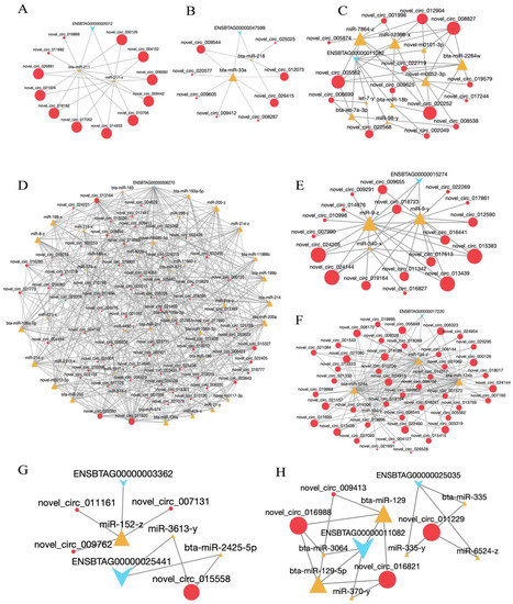 In the mammary gland, the ceRNA regulatory network contained 2268 circRNA- mRNA pairs, and included 145 circRNAs, 82 miRNAs, and 922 mRNAs (Supplementary Table S6). We found that novel_ circ_ 007131, novel_ circ_ 009762 and novel_ circ_ 011161 co-regulated miR-152-z, and affected the expression of the target gene HSP90B1 (ENSBTAG00000003362, Figure 8G). Moreover, the expression of HSPA1A (ENSBTAG00000025441, Figure 8G) was regulated by novel_circ_015558, and bta-miR-2425-5p and miR-3613-y. The subnetworks of novel_circ_011229- PRLR (ENSBTAG00000025035) are shown in Figure 8H. PRLR was regulated by bta-miR-335, miR-335-y, and miR-6524-z. IGF-1 (ENSBTAG00000011082) expression was regulated by three circRNAs (novel_circ_009413, novel_circ_016821, and novel_circ_016988) and four miRNAs (bta-miR-129, bta-miR-129-5p, miR-370-y, and bta-miR-3064). Of these, novel_circ_016821 and bta-miR-129 were the main regulatory factors (Figure 8H).
