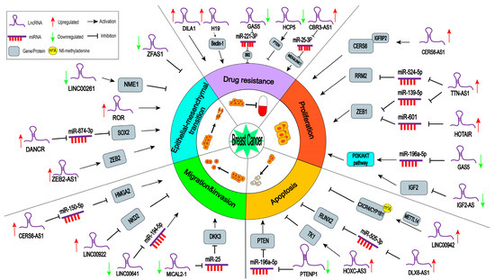Long non-coding RNAs (lncRNA) represent a subtype of non-coding RNA (ncRNA) transcripts without protein-coding ability, which are longer than 200 nts in length [4]. Over the past few years, thousands of lncRNAs have been identified based on high-throughput RNA sequencing and bioinformatics analyses [5]. Moreover, numerous studies have revealed the crucial roles of lncRNAs in diverse cellular contexts and multiple biological processes, including cancers [6]. Based on the TCGA database, around 1059 dysregulated lncRNAs have been identified in breast cancer tissues [7]. More than that, plenty of studies have highlighted the particular functions of lncRNAs in the cell proliferation, apoptosis, cell metastasis and invasion, epithelial–mesenchymal transition (EMT), and drug resistance of breast cancer [8,9,10,11,12]. Moreover, lncRNAs have several clinical pathological features of breast cancer patients, such as tumor node metastasis (TNM) stage, tumor size, and lymph node metastasis [10,13,14]. Over the past few decades, studies on lncRNAs have revealed that the dysregulated lncRNAs in breast cancer are significantly associated with the survival rate and recurrence of breast cancer patients [11,15]. Thus, these characteristics have highlighted the potential use of lncRNAs for breast cancer diagnosis. These lncRNAs in breast cancer tissues may be developed as diagnostic biomarkers. Additionally, circular RNAs (circRNAs) represent a class of ncRNAs with a unique circular configuration in structure [16]. circRNAs can interact with RNAs and proteins to be involved in gene regulation at the transcription or post-transcription levels [17]. Furthermore, many studies have highlighted the critical roles displayed by circRNAs in breast cancer development.
