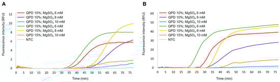Setting up simplex DARQ-LAMP assays. (A) Schistosoma mansoni DARQ-LAMP. (B) Strongyloides venezuelensis DARQ-LAMP. Evaluation of 15% and 10% percentages of quencher probe duplex (QPD) in relation to the total amount of unlabeled FIP and different supplementary MgSO4 concentrations (4, 6 and 8 mM) to obtain final MgSO4 concentrations of 6, 8 and 10 mM are indicated. NTC, non-template control (ultrapure water instead gDNA); RFU, relative fluorescence units.