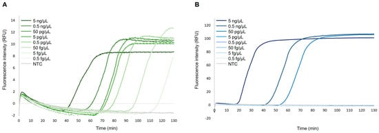 Sensitivity assessment of simplex DARQ-LAMP assays using the Genie III handheld device. (A) Analytical sensitivity for Schistosoma mansoni DARQ-LAMP reaction. (B) Analytical sensitivity for Strongyloides venezuelensis DARQ-LAMP reaction. The 10-fold serial dilutions (5 ng/µL to 5 fg/µL) of gDNA from parasites are represented by different shades of green (for Sm) and blue (for Sv). NTC, non-template control (ultrapure water instead gDNA) is represented by grey lines in both cases. RFU, relative fluorescence units.