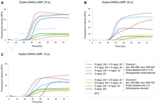 Duplex DARQ-LAMP for simultaneous amplification of gDNA from Schistosoma mansoni and Strongyloides venezuelensis using different combinations of gDNA concentrations as template in different volumes of master mixes. (A) Duplex DARQ-LAMP in 25 µL. (B) Duplex DARQ-LAMP in 20 µL. (C) Duplex DARQ-LAMP in 15 µL. Combinations of gDNA concentrations of the two parasites used as templates are indicated on the right panel. NTC, non-template control (ultrapure water instead gDNA). The reactions were carried out in a PCR max Eco 48 Real Time PCR System. Dotted lines indicate fluorescence reading in channel 1 for Strongyloides venezuelensis amplification (probe labelled with 6-FAM) and continuous lines indicate fluorescence reading in channel 4 for Schistosoma mansoni amplification (probe labelled with Cy5).