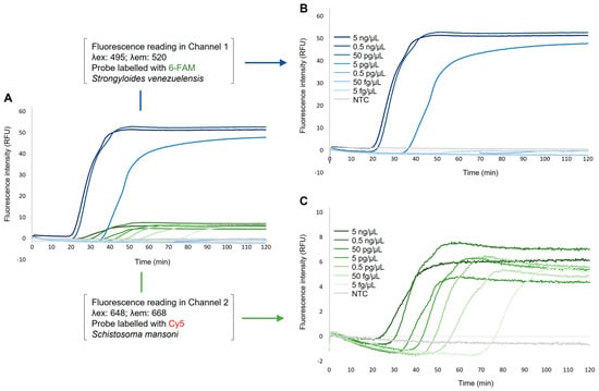 Sensitivity assessment of duplex DARQ-LAMP assay using the Genie III handheld device. (A) Analytical sensitivity for simultaneous detection of Schistosoma mansoni gDNA and Strongyloides venezuelensis gDNA using 10-fold serial dilutions. (B) Analytical sensitivity for S. venezuelensis in duplex DARQ-LAMP reaction. Only the excitation (λex = 495) and emission (λem = 520) channel 1 for fluorescence measurement of 6-FAM is represented. (C) Analytical sensitivity for S. mansoni in duplex DARQ-LAMP reaction. Only the excitation (λex = 648) and emission (λem = 668) channel 2 for fluorescence measurement of Cy5 is represented. The 10-fold serial dilutions (5 ng/µL to 5 fg/µL) of gDNA from parasites are represented by different shades of blue (for S. venezuelensis) and green (for S. mansoni). NTC, non-template control (ultrapure water instead gDNA) is represented by grey lines in both cases. RFU, relative fluorescence units.