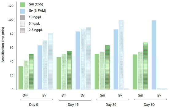Amplification time of duplex Dry-DARQ-LAMP assays as a function of storage time at ambient temperature. Amplification times of different concentrations of gDNA (10 ng/µL, 5 ng/µL and 2.5 ng/µL) from both Schistosoma mansoni (Sm) and Strongyloides venezuelensis (Sv) in duplex DARQ-LAMP assays performed with dry mixtures containing sets of primers and fluorescence labelled-probes tested at 0, 15, 30 and 60-days post-desiccation are represented. Al reactions were performed in a Genie III portable instrument.