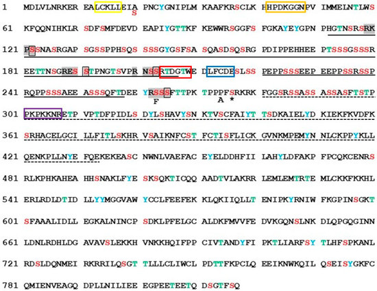 MCPyV LTag is a817 amino acids long and has a statistical overrepresentation of the serine (S), threonine (T), and 24 tyrosine (Y) residues in the N-terminal domain (Figure 1). These residues form putative phosphoacceptor sites for protein kinases. Previous studies have shown that LTag can be phosphorylated at several residues, but which protein kinases are responsible for phosphorylation, and the biological consequence of phosphorylation are incompletely known (Supplementary Figure S1 and Supplementary Table S1). Mutations of some residues resulted in increased stability of LTag (S147A and S239A; [10,11]), whereas others partially inhibited the growth of MCPyV-positive cells (S219A; [12]). The T297A mutant displayed increased binding to the viral origin of replication and increased replication of viral DNA compared to wild-type LTag, whereas the opposite was observed for the T299A mutant [13]. S816 was shown to be phosphorylated by ataxia-telangiectasia mutated protein kinase and the S816A mutation partially reversed inhibition of C33A cell growth compared to wild-type LTag, and reduced apoptosis [10,14]. The S220A mutant inhibited growth of the MCPyV-positive MKL-1 MCC cell line and impaired binding to the retinoblastoma protein. Moreover, this mutant showed increased half-life and LTag-dependent viral DNA replication compared to wild-type LTag [10,11,12,15].