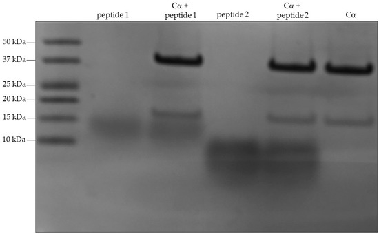 To test whether PKA could phosphorylate S191, S203, and S265, two peptides were synthesized. Peptide one encompassed S191 and S203, whereas peptide 2 contained S265 (see Section 4.6 for the peptide sequences). Before running an in vitro kinase assay on the peptides, we analyzed the peptides (2.5 μg) and the recombinant catalytic subunit of PKA (1 μg) on an acryl amide gel and visualized the peptides by Coomassie blue staining (Figure 2). A clear band of > 37 kDa is observed in the lanes with the recombinant catalytic subunit of PKA and corresponds well to the calculated molecular mass of 42.5 kDa [34]. The diffuse bands represent peptide 1 (33 amino acids) and 2 (21 residues), respectively. After in vitro analysis of kinase with the recombinant catalytic subunit of PKA, the peptides were subjected to mass spectrometry. The results showed that phosphorylation occurred on S202 and/or S203 and on S264 and/or S265. No phosphorylation was found on S191 (Supplementary Table S2 and Supplementary Figure S2).