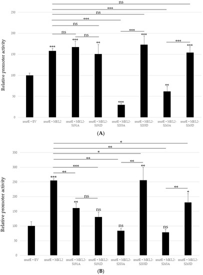 2.4. Non-Phosphorylable and Phosphomimicking Substitutions of the PKA Phosphoacceptor Sites Have Opposite Effect on MKL2 LTag Induced Activation of the MCPyV Promoters