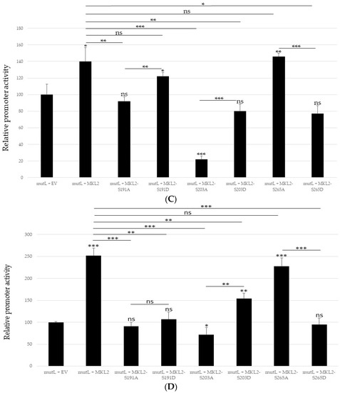 Because MCPyV-positive MCCs express C-terminal truncated LTag, we examined the role of the putative PKA sites in the truncated LTag variant expressed in the virus-positive MCC cell line MKL2. Single mutations with the replacement S203A and S265A reduced transactivation of the MCPyV early promoter by MKLK2LTag, whereas substitutions S203D and S265D restored the induction of the early promoter by MKL2 LTag. Mutations of S191 did not affect stimulation of the early promoter by MKL2 LTag (Figure 6A). However, at higher concentrations of transfected plasmid (400 ng versus 100 ng), both the S191A and S191D partially reduced transactivation of the early promoter, compared to non-mutated MKL2 LTag (Figure 6B). MKL2 LTag stimulated MCPyV late promoter activity, whereas the MKL2-S191A and the MKL2-S203A mutants exerted an inhibitory effect on this promoter (Figure 6C,D). The S265A MKL2 LTag mutant retained the ability to stimulate the late promoter. S191D and S265D MKL2 LTag mutants reduced late promoter activity compared to MKL2 LTag, whereas the phosphomimicking S203D mutants behaved as non-mutated MKL2 LTag, and restored the inhibitory effect observed for MKL2-S203A (Figure 6C,D).