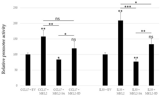 Mutations in the PKA phosphoaccpetor sites of MKL2 LTag affect transactivation of the CCL17 and IL33 promoters. Cells were co-transfected with a luciferase reporter plasmid containing the sequences −2535/+40 of the CCL17 promoter or −1050/+45 of the IL33 promoter, and empty expression vector (EV) or expression vector for MKL2, MKL2-3A, or MKL2-3D LTag. The bars represent the average of three independent parallels ± SD. The statistically significant difference between promoter activity in the presence of EV and MKL2 (respectively MKL2-3A and MKL2-3D) is shown on top of the bars, whereas differences between MKL2 and the mutants and between MKL2-3A and MKL2-3D are given on top of the lines. * p < 0.05, ** p < 0.01, and *** p < 0.001, ns = not significant.