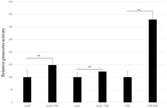 Activation of the PKA pathway does not induce the MCPyV early and late promoter. HaCaT cells were transfected with a luciferase reporter plasmid containing either the MCPyV early or late promoter, or a minimal promoter with four copies of the cAMP response element consensus sequence (CRE). Cells were serum-starved for 24 h and then treated with 10 μM forskolin (FSK) for 1 h. Luciferase activity was corrected for protein concentration in each sample, and promoter activity in the absence of forskloin was set as 100%. Each bar is the average of three independent parallels ± SD. The statistical significance between non-treated and forskolin treated cells is shown with ns = not significant and *** p < 0.001. The results of a representative experiment are shown.