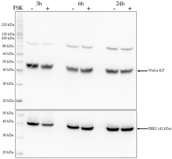 The MCPyV-positive MCC cell line WaGa was treated with forskolin. Cells were serum-starved for 18 h and then exposed to 10 μM forskolin. MCPyV LTag expression levels were analyzed 30 min, 60 min, 180 min, 360 min, and 24 h after forskolin treatment. No increase in LTag levels was observed compared to mock treated cells for any of the time points (Figure 10 and results not shown). ERK2 was used as a loading control because it has been shown to be a reliable control protein for equal protein loading, and ERK2 expression levels are not affected by forskolin [44,45,46]. Similar results were obtained in MS1 cells, another virus positive MCC cell line. No change in MS1 LTag levels were observed in these cells treated for 30 min, 60 min, 180 min, 360 min, and 24 h (Supplementary Figure S5).