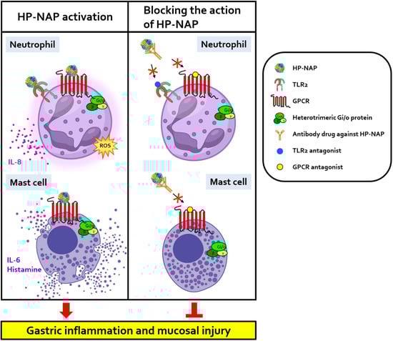 Schematic presentation of HP-NAP as a therapeutic target in the treatment of H. pylori-associated gastric diseases. The binding of HP-NAP to a PTX-sensitive GPCR induces the production of ROS by neutrophils and the secretion of IL-6 and histamine by mast cells. HP-NAP also induces neutrophils to release IL-8 via the activation of TLR2 and PTX-sensitive G proteins. Inhibition of the interactions between HP-NAP and its receptors by antibody drugs against HP-NAP and antagonists specific to the receptors of HP-NAP could relieve the gastric inflammation and mucosa injury caused by H. pylori infection. “↓” indicates induction; “⊥” indicates inhibition. GPCR, G protein-coupled receptor; HP-NAP, H. pylori neutrophil-activating protein; IL-6, interleukin-6; IL-8, interleukin-8; ROS, reactive oxygen species; TLR2, Toll-like receptor 2.