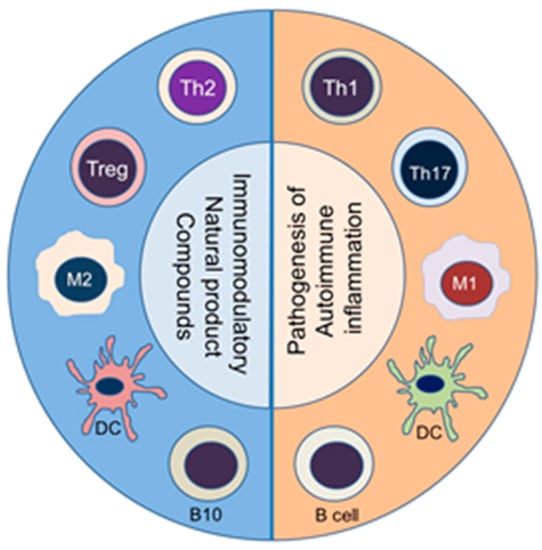 Naïve T cells that are activated by a particular self-antigen can acquire different phenotypes depending on the local milieu, particularly the type of cytokines present. Accordingly, naïve T cells can differentiate into distinct T helper (Th) type, such as Th1 or Th17 cells, which can mediate pathogenic effector functions [53,71,72]. Under another set of conditions, a naïve T cell can develop into Th2 or T regulatory cells (Treg), which can control the activity of pathogenic Th cells [53,64]. The Th cells secrete prototypic cytokines and express a distinct transcription factor [72]. Among the cytokines, interferon-γ (IFN-γ) and IL-17 are shown to promote inflammation, whereas IL-4 and IL-10 inhibit inflammation [52]. An imbalance between pro-inflammatory and anti-inflammatory cytokines, as well as that between pathogenic (Th1/Th17) and protective (Th2/Treg, respectively) T cells have been reported in various autoimmune diseases [64,73,74]. A similar imbalance can occur in macrophage subsets, such as pro-inflammatory M1 macrophages versus anti-inflammatory M2 macrophages; in dendritic cells (DCs), such as activating DCs versus tolerogenic DCs; and in B cells, such as antibody-producing B cells versus regulatory B cells that secrete IL-10 (known as B10 cells) (Figure 1). Accordingly, a deliberate re-setting of the balance between these cytokines (e.g., IFN-γ/IL-4 balance) and immune cell subsets (e.g., Th17/Treg balance) is one of the approaches under development for the treatment of these diseases [75]. This principle is also being exploited by using natural products compounds (Figure 1).