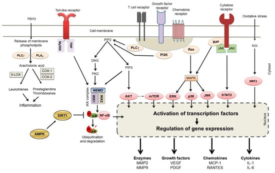 A summary of the main biochemical pathways involved in autoimmune inflammation that are targeted by natural product compounds. Representative mediators of inflammation following modulation of gene expression are shown. (Abbreviations: AKT = an oncogene, also known as protein kinase B or PKB; AMPK = adenosine monophosphate-activated protein kinase; COX; cyclooxygenase, DAG, diacyl glycerol; ERK, extracellular signal-regulated kinase; IKK, IκB kinase; IL = interleukin; IP3, inositol triphosphate; JAK, janus kinase; JNK, c-Jun N-terminal kinase; LO (or LOX), lipoxygenase; MAPK, mitogen-activated protein kinase; MCP-1 = monocyte chemoattractant protein; MMP = matrix metalloproteinase; mTOR, mammalian target of rapamycin; MyD88, myeloid differentiation primary response gene 88; NEMO, NF-κB essential modulator; NF-κB, nuclear factor kappa-light-chain-enhancer of activated B cells; Nrf-2, nuclear factor erythroid 2-related factor 2; PDGF = platelet-derived growth factor; PI3K, phosphatidylinositol-3-kinase; PIP, phosphatidylinositol bisphosphate; PLA2, phospholipase A2; PLCγ, phospholipase C gamma; RANTES = Regulated upon Activation, Normal T Cell Expressed and Presumably Secreted; Ras = Ras oncogene; ROS = reactive oxygen species; STAT, signal transducer and activator of transcription; SIRT1 = Sirtuin 1; TRIF, TIR-domain-containing adapter-inducing interferon-β; and VEGF = vascular endothelial growth factor).