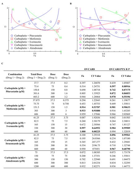 2.2. Combining Reporposed Drugs with Carboplatin Has a Synergistic Effect on OVCAR8 and OVCAR8 PTX R P Cells
