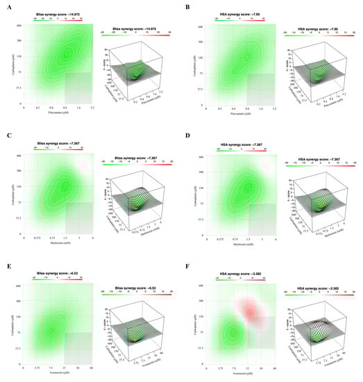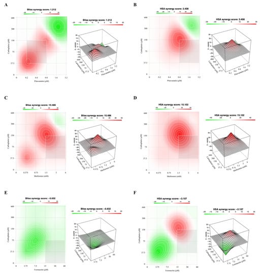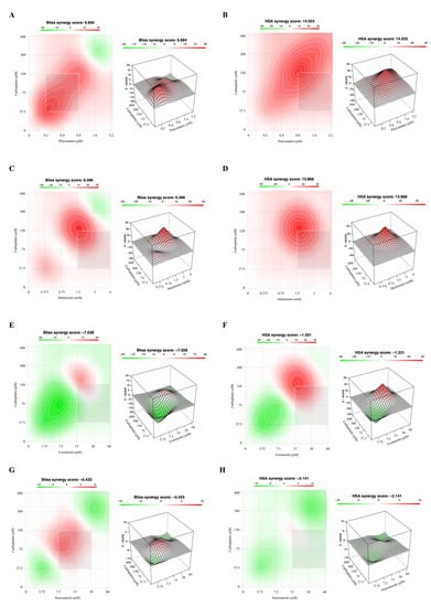 Since the methods used to predict synergism have different mathematical frameworks [36] and can produce slightly different outcomes, we also evaluated the drug interactions using the Bliss Independence and Highest Single Agent (HSA) models (Figure 4 and Figure 5), to compare if the results corroborated the CI values previously obtained by the Chou–Talalay method. The Bliss Independence model stipulates that two compounds produce independent effects, and the predictable combination effect could be assessed centered on the probability of independent events [36,37,38]. The HSA model assumes that the expected combination effect is the highest effect achieved by the most effective drug [36,37,39,40]. For these two models, the synergy score for a drug combination is averaged over all the dose combination measurements giving a positive (synergy, red) and negative (antagonism, green) synergy score values [39,41].