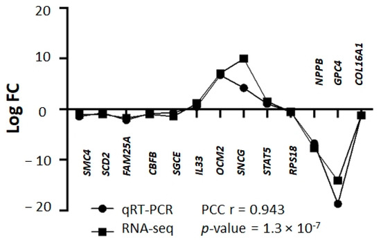 Validation of RNA-seq data using qRT-PCR. Squares bar—logFC values of RNA-seq, bullets bar—logFC values of qRT-PCR. Pearson correlation coefficient (PCC) r = 0.943; p-value = 1.3 × 10−7. Please note that standard deviation (SD) is not shown here as logFC values of DEGs and qRT-PCR were calculated based on the average CT values of triplicates. The representative results of 13 DEGs are shown.