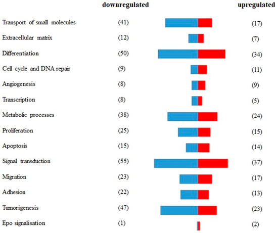 Segregation of differentially expressed genes (DEGs) according to the GO biological processes. A total of 233 DEGs expressed in RAMA 37-28 versus RAMA 37 cells were validated and divided according to GO biological processes and using the peer-reviewed server Omnalysis. Blue bars—downregulated DEGs. Red bars—upregulated DEGs. Number of DEGs is displayed in parenthesis.