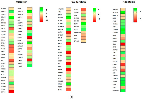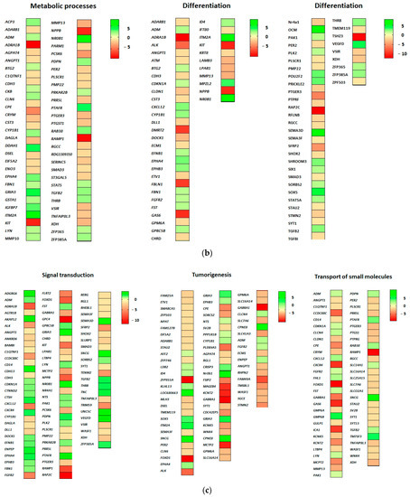 (a) DEGs related to proliferation, apoptosis and cell migration. (b) DEGs related to metabolic processes and cell differentiation. (c) DEGs related to signal transduction, cell transport and tumorigenesis. Green-shaded genes—upregulated, red-shaded genes—downregulated. Shading intensity indicates the degree of upregulation or downregulation. Range of the fold change (logFC values) is presented in the scale.