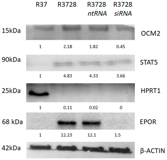 Western blot analysis of representative proteins (OCM2, STAT5A, HPRT1, EPOR) as validation of proteomic data. EPOR-induced changes were confirmed by specific siRNA designed against EPOR mRNA.