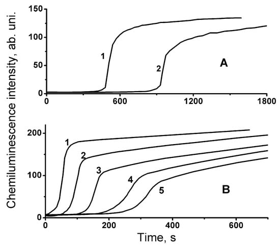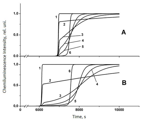 The intricacies of the chemiluminescence kinetics derived from newly considered elementary reaction steps are particularly noteworthy. First of all, a comparison of the “equikinetic” chemiluminescence time profiles (i.e., the ones which pertain to the same values of k7) reveals that the effect of reaction (6) on the chemiluminescence emission is ambiguous. Thus, we have noticed that at small k7 values (curves 1 and 2 in Figure 3 and Figure 4), the replacement of k6 = 103 by k6 = 104 M−1s−1 (transition from A to B in Figure 4) reduces the induction period since the increase in k6 lowers the concentration of free radicals AO˙ and, hence, the probability of their interaction with peroxide radicals, while the AAOH dimer formed by reaction (6) is insufficiently active due to low k7. Conversely, at high values of k7 = 105 to 106 M−1s−1, a comparison of the “equikinetic” light-intensity curves (4–6 in A and B, Figure 4) reveals the higher antioxidant activity in case B. This can be rationalized by the fact that, due to the enhancement of the activity of the AAOH dimer (an increase of k7 by the order of magnitude), the contribution of reactions (7) and (8) (removing peroxide radicals) increases, which leads to the inhibition of the chain oxidation process.