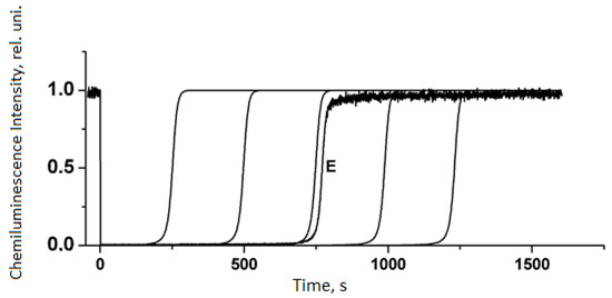 Kinetic curves of the chemiluminescence intensity manifesting the antiradical effect of antioxidants in the chlorobenzene solution of ethylbenzene (1.86 M) upon its oxidation by the ambient oxygen at the initiation rate of 2.43 × 10−8 Ms−1. Experimental curve E refers to the action of α-tocopherol at the concentration of 9.06 µM, while the other curves are the results of computer modeling in a framework of Scheme 1 at initial antioxidant concentrations of 3, 6, 9.06, 12, 15 µM, correspondingly.