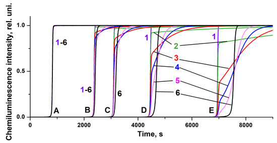 Computed chemiluminescence kinetic curves at the k7 values equal to 0 (1), 1 × 104 (2), 5 × 104 (3), 1 × 105 (4), 2 × 105 (5), 1 × 106 (6) M−1s−1. The values of the initial antioxidant concentration are 1 × 10−5 (A), 3 × 10−5 (B), 4 × 10−5 (C), 6 × 10−5 (D), 1 × 10−4 (E) M; the reaction initiation rate is 2.43 × 10−8 M−1s−1.