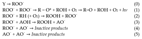 However, the question arises, how would the light-emission kinetics differ from the ideal case (Scheme 1) if by-products with antiradical activity are formed in the oxidation process? For instance, it is known that natural bioantioxidants are capable of forming dimers and other products containing hydroxyl groups, the presence of which is typical for radical scavengers [18,19,20,21]. This issue is of prime importance for the further design of efficient and reliable bioantioxidant sensory systems, most prominently for biomedical applications (e.g., for assaying the intricacies of bioantioxidant activity of diverse biological samples, drugs and their stabilizers, as well as environmental pollutants). In the present work, we examined the antiradical activity of natural lipids to establish a possible mechanism for the influence of bioantioxidant products on the chemiluminescence kinetic and to expand model concepts of their action on the oxidation processes in order to improve the reliability of bioantioxidant assays.