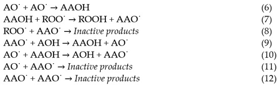 We assumed that the chemiluminescence kinetics were influenced by the products of the transformation of bioantioxidants capable of reacting with free peroxide radicals, ROO˙. Thus, the additional elementary reactions, which are exhibited in Scheme 2, need to be added to the reaction mechanism; the latter constitutes the extension of Scheme 1. These additional reaction steps refer to the formation of the AAOH dimer (reaction (6)) and its interaction with the peroxide radicals, ROO˙, to form the radicals AOO˙ (reaction (7)). Furthermore, the interactions of the mentioned species with the other components of the reaction system (reactions (8)–(12)) were added to the extended reaction sequence, on the basis of which further computer modeling was carried out.