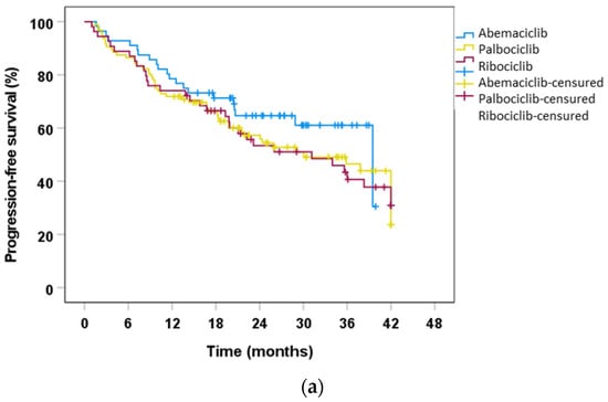 Follow up was much shorter for abemaciclib (40.28 months vs. 75 months for palbociclib and 64.4 months for ribociclib) because it was the last drug to be approved. Therefore, we used a cut-off time of 42 months for the PFS and OS analyses to compare them. PFS was 39.49 months with abemaciclib, 30.03 months with palbociclib, and 31.14 months with ribociclib (Figure 1a). These were not statistically significant differences when using the Kaplan−Meier test. Regarding dose reductions, we found no significant differences among the three CDK4/6i in PFS in patients who required CDK4/6i dose adjustments. In these patients, the median PFS for palbociclib was 35.87 months and 36.01 months for ribociclib. The median PFS for abemaciclib was not reached at the cutoff. After the established follow-up period, 109 (52.9%) patients were still on CDK4/6i treatment and 97 (47.1%) patients had progressed, 60 (29.1%) of whom had died. Among the patients who died, 14 of them (25.5%) received abemaciclib, 26 (47.3%) palbociclib, and 15 (27.3%) ribociclib. Concerning OS, the whole study population presented an OS of 57.56 (95% CI, 44.59–70.52 months). In the Kaplan−Meier analysis performed, we found no significant differences in OS among the three inhibitors, and the median was not reached by any of the three drugs after 42 months of follow up (Figure 1b).