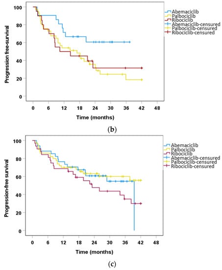 The median PFS in our population receiving ribociclib was 31.14 months (95% CI, 15.78–46.52). These results were compared to the PFS achieved in the ribociclib trials including both endocrine-resistant and -sensitive patients. In MONALEESA 3, the median PFS achieved with ribociclib in the first-line treatment cohort was 33.6 months (95% CI, 27.1–41.3), while in MONALEESA 7 the PFS was 23.8 months (95% CI, 19.2, not reached) [13,37]. However, it should be noted that MONALEESA 7 included only premenopausal patients and up to 70% of patients had disease recurrence compared with 59% in our population [37]. Our PFS for palbociclib was approximately 30 months (95% CI, 17.41–22.85). It was longer according to the results from the Spanish real-world data database of palbociclib (PALBOSPAIN) as first-line therapy, which showed a median PFS of 24 months (95% CI, 21–27) [34]. Although the proportion of postmenopausal patients was much lower in the PALBOSPAIN study (64.8% vs. 79% of our study population, respectively), the presence of visceral metastases (59.3% vs. 54.9%) and de novo metastatic disease (29.6% vs. 30.6%) were similar in both studies. Therefore, it is likely that these differences in PFS were also related to other clinical characteristics. Finally, there was a trend towards better PFS with abemaciclib (39.5 months, 95% CI, 24.58–54.4), but it did not reach statistical significance. Univariate logistic regression supported these results, with a two-fold lower risk of cyclin C progression in favor of abemaciclib compared with palbociclib and ribociclib.