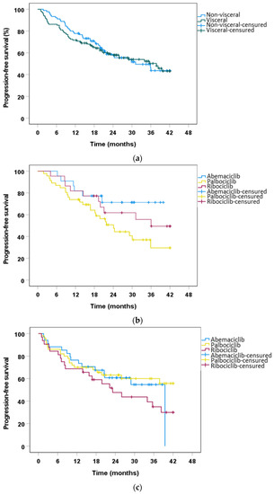 Kaplan-Meier analysis of progression-free survival benefit of the three CDK4/6i in visceral and non-visceral disease. (a) Kaplan−Meier analysis of PFS comparing the non-visceral vs. visceral population, p = 0.469, by Breslow test. (b) Kaplan−Meier analysis of PFS comparing the three CDK4/6i in the population without visceral involvement. Abemaciclib−palbociclib, p = 0.038, by log rank test; abemaciclib−ribociclib, p = 0.581, by Breslow test; palbociclib−ribociclib, p = 0.163, by log rank test. (c) Kaplan−Meier analysis of PFS comparing the three CDK4/6i in the population with visceral disease. Abemaciclib−palbociclib, p = 0.937, by Breslow test; abemaciclib−ribociclib, p = 0.307, by Breslow test; palbociclib−ribociclib, p = 0.255, by Breslow test.