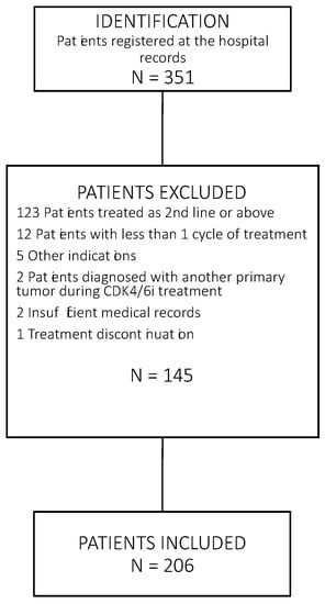 A search was conducted on patients diagnosed with locally advanced or metastatic ER-positive and HER-2-negative breast cancer who were treated with CDK4/6i as a first-line therapy at the Hospital Virgen del Rocio between April 2014 and September 2021. Those who received at least one cycle of treatment with abemaciclib, palbociclib, or ribociclib plus ET and were followed up on for at least 1 year were selected. Patients who had received previous therapy for metastatic breast cancer were excluded. The patient selection procedure is shown in Figure 4. The selected population was monitored retrospectively. Endocrine resistance was established following the fourth ESO-ESMO International consensus recommendations. Primary endocrine resistance was defined as a relapse during the first 2 years of adjuvant ET, or disease progression within the first 6 months of first-line ET for metastatic breast cancer. Secondary endocrine resistance was defined as a relapse while on adjuvant ET, but after the first 2 years, or relapse within 12 months of completing adjuvant ET, or disease progression >6 months after initiating ET for metastatic breast cancer. Toxicity was graded according to the Common Terminology Criteria for Adverse Events (CTCAE). Treatment prescription and toxicity management were carried out according to the local product label. All premenopausal patients received parallel ovarian function suppression with luteinizing hormone-releasing hormone inhibitors, pelvic radiation double oophorectomy. Follow-up visits and tumor evaluations were carried out according to standard clinical practice. In general, patients were visited every 15 days for the first two months. Thereafter, visits were monthly until the sixth month, and then quarterly. Tumor assessments were carried out every 3–4 months. Those cases in which the disease was controlled after 2 years of treatment were seen every 4−6 months. ORR was defined as a patient proportion showing complete response or partial response over total patient population based on RECIST 1.1. Disease progression was determined by the recorded assessment of the attending clinician based on radiology, pathology, and clinical assessment. Data regarding histologic type, hormone receptors, Ki67 expression, and HER2 status were collected from pathology reports. Tumor stage and other clinical data, including treatment information, were obtained from electronic medical records. The study procedures were approved by the Coordinating Committee on Biomedical Research Ethics of Andalucía (0920-N20).
