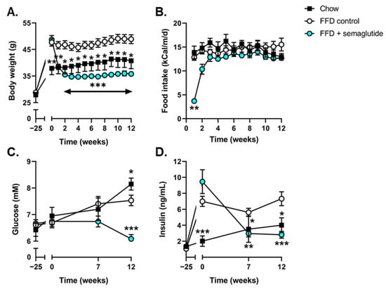 At the start of treatment, Ldlr-/-.Leiden mice had developed pronounced obesity compared with mice fed healthy chow, and their body weight remained stable until the study endpoint (Figure 1A). Twelve weeks of semaglutide treatment significantly reduced body weight (−27%, p < 0.001, vs. FFD control at t = 12 weeks) (Figure 1A) despite similar levels of calorie intake (Figure 1B). Suppression of food intake was temporarily observed during the first days of semaglutide intervention; however, food intake was restored within three days to levels comparable to chow and FFD controls. Compared to FFD controls, blood glucose levels in semaglutide-treated mice tended to be decreased after 7 weeks (−9%, p = 0.07) and were significantly decreased at t = 12 weeks (−19%, p < 0.001) (Figure 1C). Semaglutide significantly reduced plasma insulin concentrations at 7 and 12 weeks after treatment initiation (−47%, p < 0.01 and −61%, p < 0.001, vs. FFD control at t = 7 and t = 12 weeks, respectively) (Figure 1D).