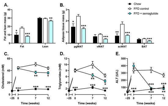 Body composition and plasma levels of cholesterol, triglycerides and ALT were ameliorated in semaglutide-treated mice. Fat mass and lean mass (A), perigonadal white adipose tissue (WAT), visceral WAT, subcutaneous WAT and interscapular brown adipose tissue (BAT) (B), plasma cholesterol (C), plasma triglycerides (D) and plasma alanine transaminase (ALT) (E) were determined at several timepoints or at the study endpoint. Values are presented as mean ± SEM for n = 8 mice on chow diet, n = 15 fast-food diet (FFD) control mice and n = 15 mice on FFD supplemented with semaglutide. * p < 0.05, ** p < 0.01, *** p < 0.001 vs. FFD control.
