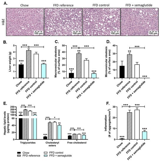 Hepatic steatosis and inflammation were ameliorated with semaglutide treatment in Ldlr-/-.Leiden mice. Representative histological photomicrographs of H&E-stained liver cross-sections (A), liver weight (B), macrovesicular steatosis (C) and microvesicular steatosis (D) as percentage of surface area, hepatic concentrations of triglycerides, cholesteryl esters and free cholesterol (E) and the number (#) of inflammatory aggregates per mm2 microscopic field (F) were all determined at the study endpoint. Values are presented as mean ± SEM for n = 8 mice on chow diet, n = 15 on fast-food diet sacrificed at t = 0 weeks, after a 25-week run-in period (FFD reference), n = 15 on FFD until the study endpoint (FFD control) and n = 15 on FFD supplemented with semaglutide. * p < 0.05, ** p < 0.01, *** p < 0.001 vs. FFD control.