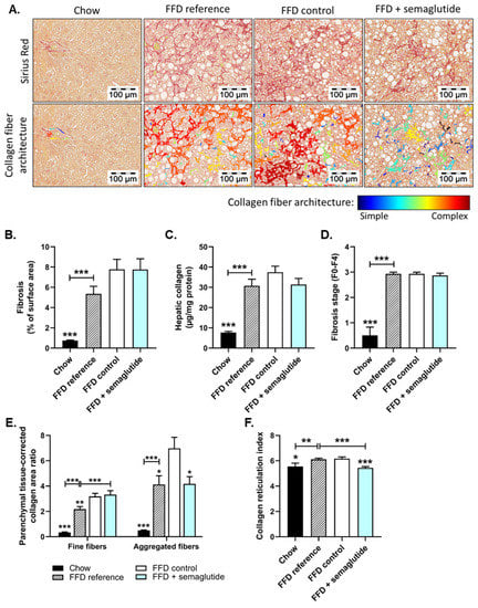 Semaglutide improved hepatic fibrosis architecture in Ldlr-/-.Leiden mice. Representative images of Sirius-Red-stained liver cross-sections and of computerized analysis of collagen fibers of the same section (A), fibrosis as percentage of surface area (B), hepatic collagen content (C), fibrosis stage (D), parenchymal-tissue-corrected area ratio of fine and aggregated collagen fibers (E) and collagen reticulation index (F). Values are presented as mean ± SEM for n = 8 mice on chow diet, n = 15 on fast-food diet sacrificed at t = 0 weeks, after a 25-week run-in period (FFD reference), n = 15 on FFD until the study endpoint (FFD control) and n = 15 on FFD supplemented with semaglutide. * p < 0.05, ** p < 0.01, *** p < 0.001 vs. FFD control.