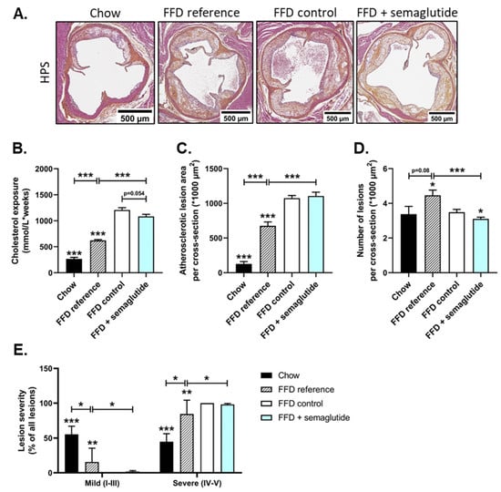 The effects of semaglutide on parameters of atherosclerosis are minimal. Representative images of HPS-stained liver cross-sections (A), cholesterol exposure (concentration*weeks) (B), atherosclerotic lesion area per cross-section (C), number of atherosclerotic lesions per cross-section (D) and lesion severity (E) were determined at the study endpoint. Values are presented as mean ± SEM for n = 8 mice on chow diet, n = 15 on fast-food diet sacrificed at t = 0 weeks, after a 25-week run-in period (FFD reference), n = 15 on FFD until the study endpoint (FFD control) and n = 15 on FFD supplemented with semaglutide. * p < 0.05, ** p < 0.01, *** p < 0.001 vs. FFD control.