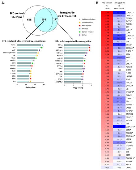 Semaglutide reverses FFD-induced expression of upstream regulators in the Ldlr-/-.Leiden mouse model, which closely represents human NASH. Venn diagram (A) showing the overlap of the predicted activation state of upstream regulators (URs) in the liver based on expression changes in known target genes. The white circle indicates Ldlr-/- mice that received the FFD for a total of 37 weeks (FFD control) vs. the healthy chow group, and the blue circle indicates mice treated with semaglutide for the final 12 weeks of the study vs. FFD control mice. The top 15 most significantly changed URs (−log(p-value)) for URs affected by FFD and reversed by semaglutide (left) and for URs affected by semaglutide but not induced by FFD (right) are shown. Heatmap (B) showing expression of genes differentially regulated in human NASH patients with severe fibrosis (stage F3 or F4) vs. NASH patients with mild fibrosis (stage F0 or F1), recapitulated in Ldlr-/-.Leiden mice fed FFD for a total of 37 weeks (FFD control) relative to chow-fed mice (left column) and semaglutide-treated mice relative to FFD control mice (right column). Red color indicates upregulation, blue color indicates downregulation and asterisks (*) indicate genes that are significantly (p < 0.05) upregulated or downregulated in semaglutide-treated mice.