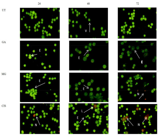 Morphological changes of HeLa cells treated with GA and MG for 24, 48 and 72 h. Untreated cells (UT) were used as a negative control and CIS as a positive control. Arrows indicate viable cell (V), early apoptotic cell (E), late apoptotic cell (L) and necrosis (N). The cells were viewed under a fluorescence microscope (100×).