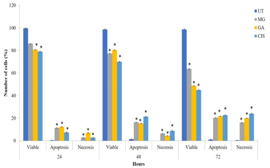 The Apoptosis event in all treated cells significantly increased in a time-dependent manner (p < 0.05) compared to UT (Figure 2). The percentages of apoptotic cells increased from 12.3% (24 h) to 15.3% (48 h) and 21.7% (72 h) in HeLa cells treated with GA. No significant difference in apoptotic cell percentages (p > 0.05) was observed between GA and MG treatment. On the other hand, necrotic cells were also observed in the treated group, which might be due to the progression of the apoptotic cells into secondary necrosis.