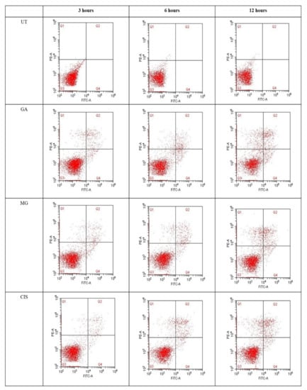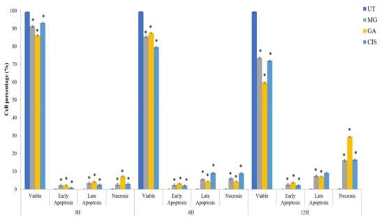 The graph summarises the number of cells in each quadrant after treatment with MG and GA for 3, 6 and 12 h. CIS was used as control positive and the untreated (UT) group as control negative. Values are mean ± S.E.M of three independent experiments (n = 3). Asterisk (*) indicates statistically significant (p < 0.05) as compared with the untreated group (UT).