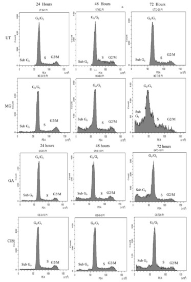 Cell cycle distribution of HeLa cells treated with MG and GA at 24, 48 and 72 h of treatment. In three independent experiments, CIS was used as a positive control and the untreated (UT) group as a negative control.
