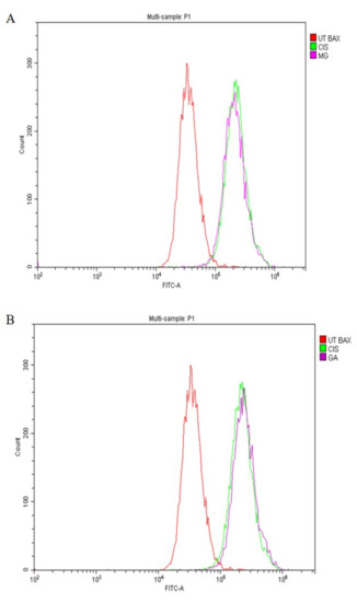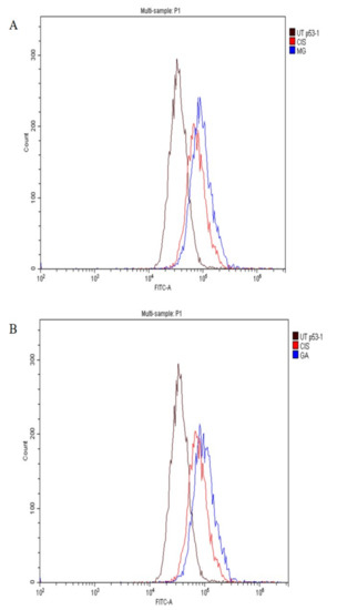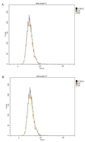 In this study, the expression of tumour suppressor proteins, p53, Bax (proapoptotic) and Bcl-2 (antiapoptotic) proteins was evaluated using flow cytometry analysis. The expression of p53 proteins after treatment with MG, GA and CIS are shown in Figure 6A,B. The expression of p53, was in accordance with the shifted cell populations in the subG0 to the right compared to UT group.