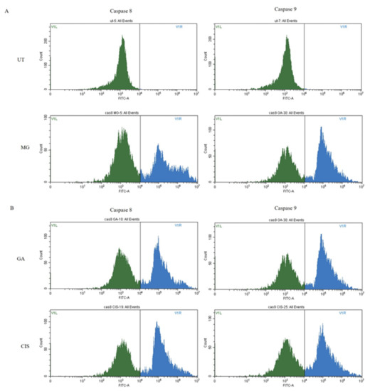 In this study, cells treated with MG and GA expressed caspase 8 and caspase 9. In comparison to the UT group, the 3 h treatment of HeLa cells with MG and GA significantly increased (p < 0.05) both caspase activity. (Figure 9A,B). The highest percentage of activity for both caspases was seen in cells treated with GA, at 50.20% and 54.26%, respectively, for caspases 8 and 9. For MG, there were not many differences in the activity of the two caspases, 44.08% for caspase 8 and 44.10% for caspase 9. Both caspases were expressed in the MG and GA-treated cells, indicating that both involved extrinsic and intrinsic apoptotic pathways.