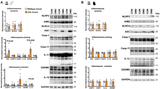 Elevated levels of cytokines, including IL-1β, have been shown in the skeletal muscle tissue of mdx mice [10]. Nevertheless, the expression of inflammasome proteins, both in skeletal muscle and cardiac tissue, has not been investigated so far. Therefore, we quantified the inflammasome priming by detecting the expression of canonical inflammasome sensors, NLRP3, AIM2, NLRC4, and non-canonical caspase-11, in parallel with downstream signaling mediators, such as an apoptosis-associated speck-like protein containing a CARD (ASC), gasdermin D (GSDMD), caspase-1, and interleukins (IL-1β and IL-18) using Western blot analysis. We also detected the cleavage of the downstream mediators to demonstrate the presence of inflammasome activation (Figure 1 and Figure 2).