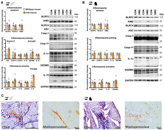 Assessment of inflammasome priming and activity in skeletal and cardiac muscle samples of 10-month old mdx mice. Western blot analysis of the inflammasome sensors (NLRP3, AIM2, NLRC4) and inflammasome activation related proteins (ASC, caspase-1, IL-1β, IL-18, and gasdermin D) in skeletal muscle (A); and left ventricular tissue (B) at the late stages of muscular dystrophy. * p < 0.05 vs. wild-type littermates, Student’s t-test; n = 5–6. (C) Representative images from immunohistochemical detection of CD68 and myeloperoxidase proteins in skeletal and cardiac muscle samples. Hematoxylin was used for the counterstain. Scale bar: 100 μm.