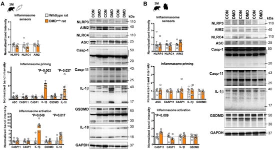 Assessment of inflammasome priming and activity in skeletal and cardiac muscle samples of 3-month old DMDmdx rats. Western blot analysis of the inflammasome sensors (NLRP3, AIM2, NLRC4) and inflammasome activation related proteins (ASC, caspase-1, IL-1β, IL-18, and gasdermin D) in skeletal muscle (A); and left ventricular tissue (B) at the early stages of muscular dystrophy. * p < 0.05 vs. wild-type littermates, Student’s t-test; n = 5–7.