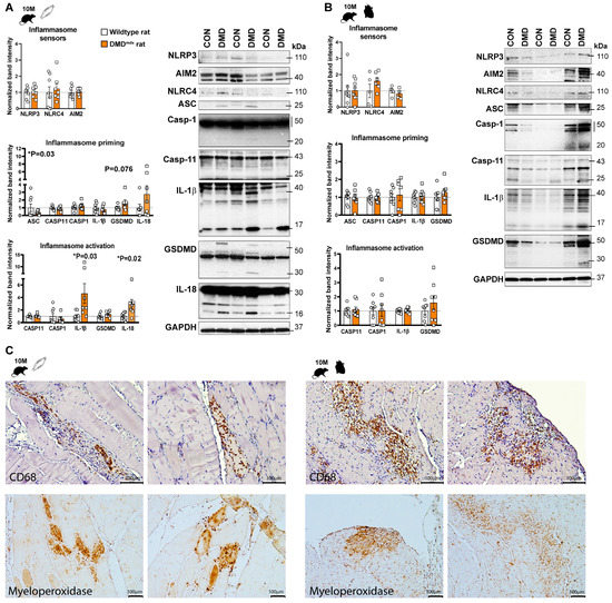 Assessment of inflammasome priming and activity in skeletal and cardiac muscle samples of 10-month old DMDmdx rats. Western blot analysis of the inflammasome sensors (NLRP3, AIM2, NLRC4) and inflammasome activation related proteins (ASC, caspase-1, IL-1β, IL-18, and gasdermin D) in skeletal muscle (A); and left ventricular tissue (B) at the late stages of muscular dystrophy. * p < 0.05 vs. wild-type littermates, Student’s t-test; n = 6–8. (C) Representative images from immunohistochemical detection of CD68 and myeloperoxidase proteins in skeletal and cardiac muscle samples. Hematoxylin was used for the counterstain. Scale bar: 100 μm.