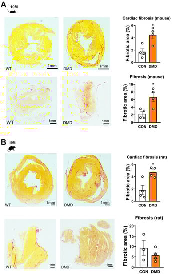 Inflammatory activity is frequently associated with progressive fibrosis in the heart or skeletal muscle, in particular at a later stage, as was reported previously [15,16,17]. Thus, we have examined the presence of fibrosis in both heart and gastrocnemius tissue samples at a later stage of the disease. In line with the previous observations, we found that the cardiac fibrosis was markedly increased in both animal models (Figure 5). We demonstrated the presence of fibrosis in the skeletal muscle tissue of mdx mouse, but we did not observe significant alterations in the DMDmdx rats (Figure 5).